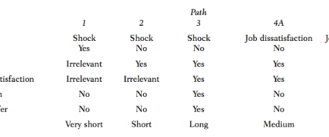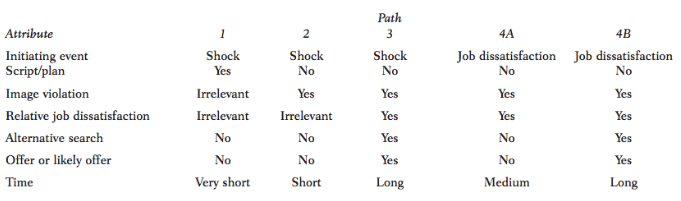 Er zijn meerdere inzichten die het beslissingsproces van een vertrekkende medewerker verklaren. In de gedachten van shocks wordt er uitgegaan van vier patronen die een medewerker voor vertrek kan doorlopen. Eén patroon heeft de variabele medewerkerstevredenheid als belangrijkste oorzaak voor het verlaten van een organisatie. De overige drie patronen gaan er vanuit dat sprake is van één of meerdere shocks. Deze kunnen zowel positief als negatief zijn en zijn ingedeeld in factoren als alternatieve functie(s), vooraf bepaalde uitstroom, etc. Een belangrijk gegeven, in geval van een shock, is dat het patroon dat de medewerker volgt wordt bepaald door de externe omgeving.